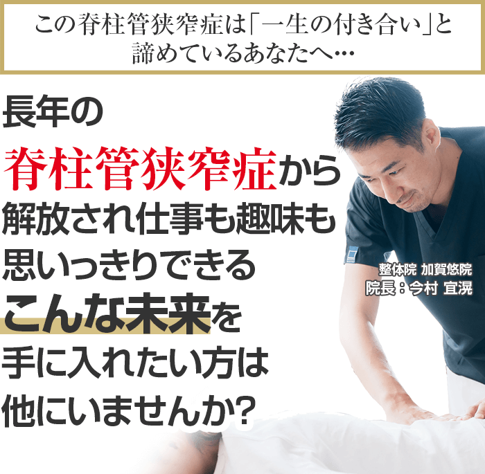 身体のプロフェッショナルとしての証である国家資格を持ち、数多くの脊柱管狭窄症のお客様を根本改善に導いてきた、整体院加賀悠院に来院し、もう二度とその痛みに悩まない人生を手に入れる道。